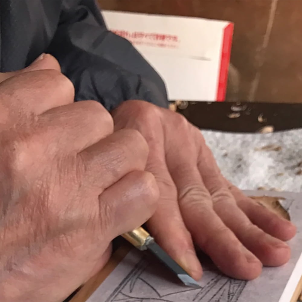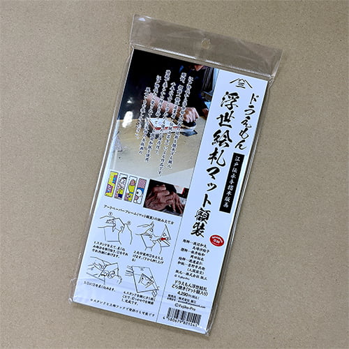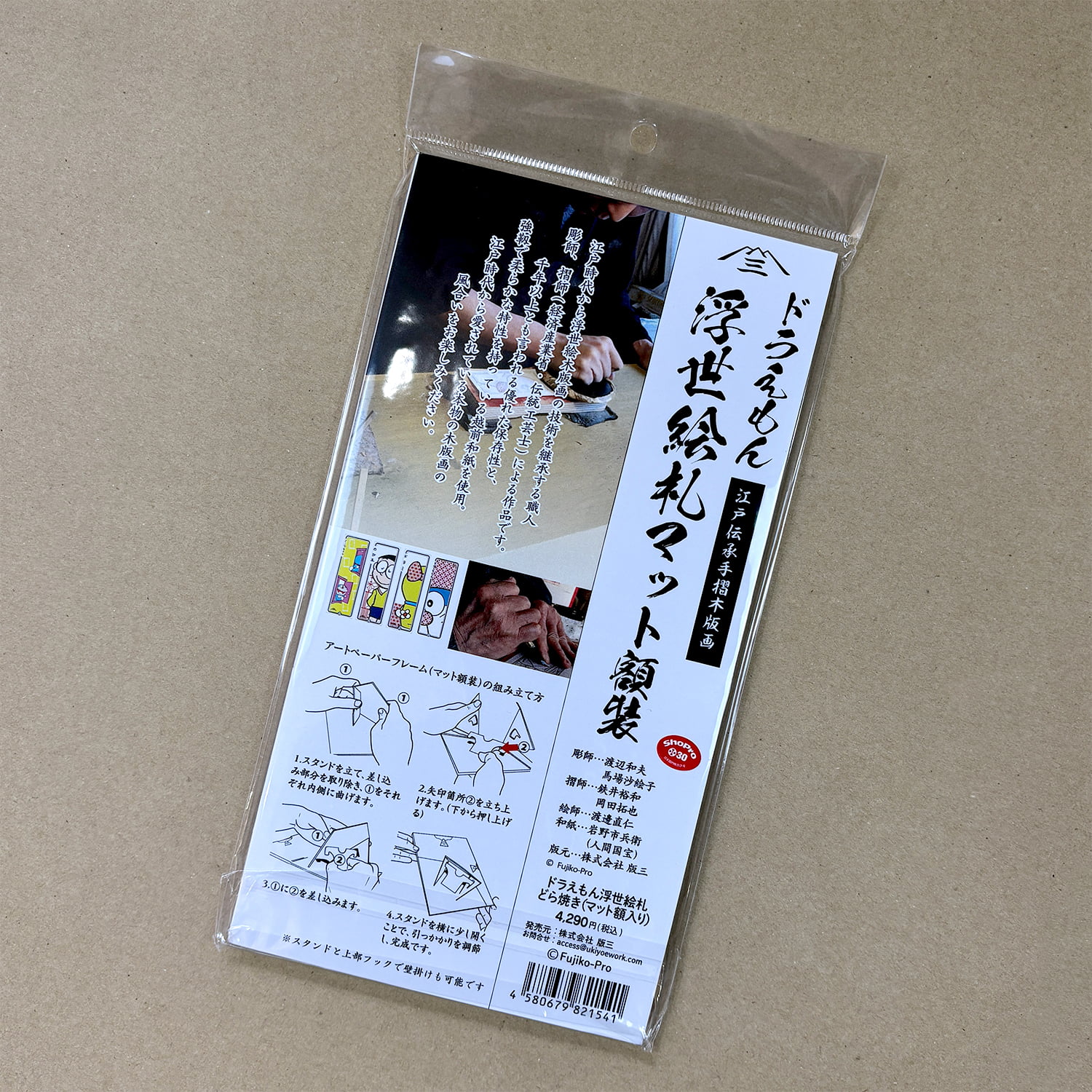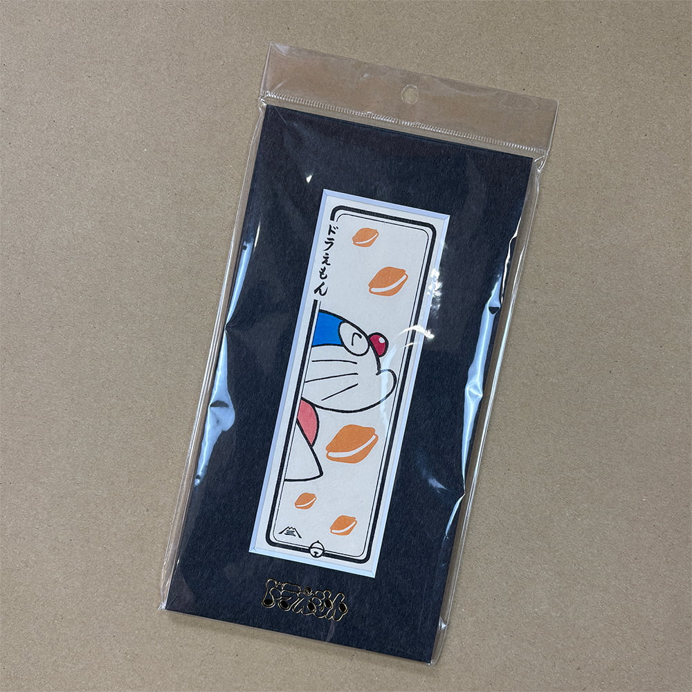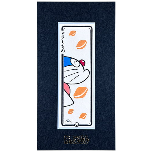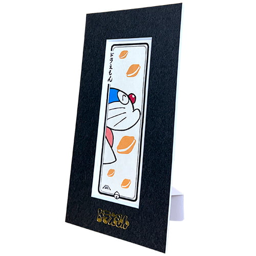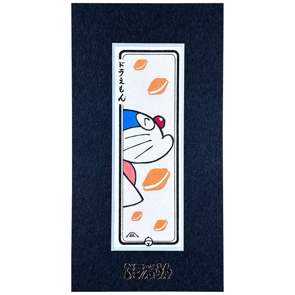 大好物のどら焼きを今にも食べそうなドラえもんの顔が可愛らしく描かれた小型の浮世絵木版画です。