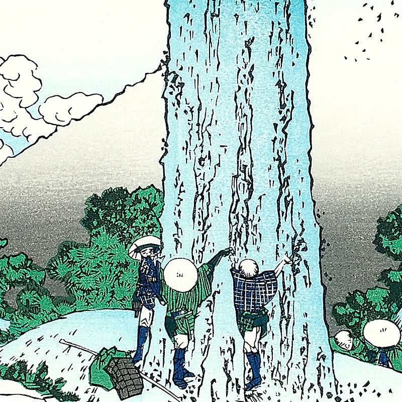 北斎は画面中央に堂々たる巨木を配し、その後方の雲中に笠雲を頂く富士を描き出すという思いもよらない奇抜な構図を見せています。