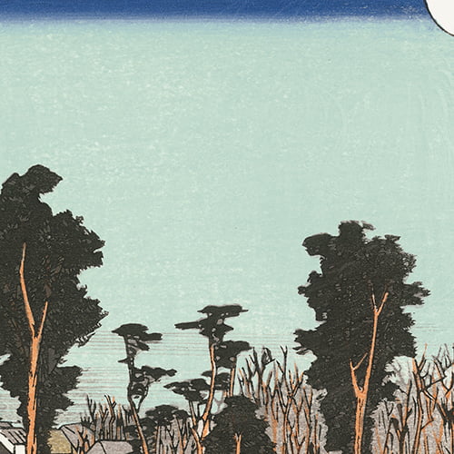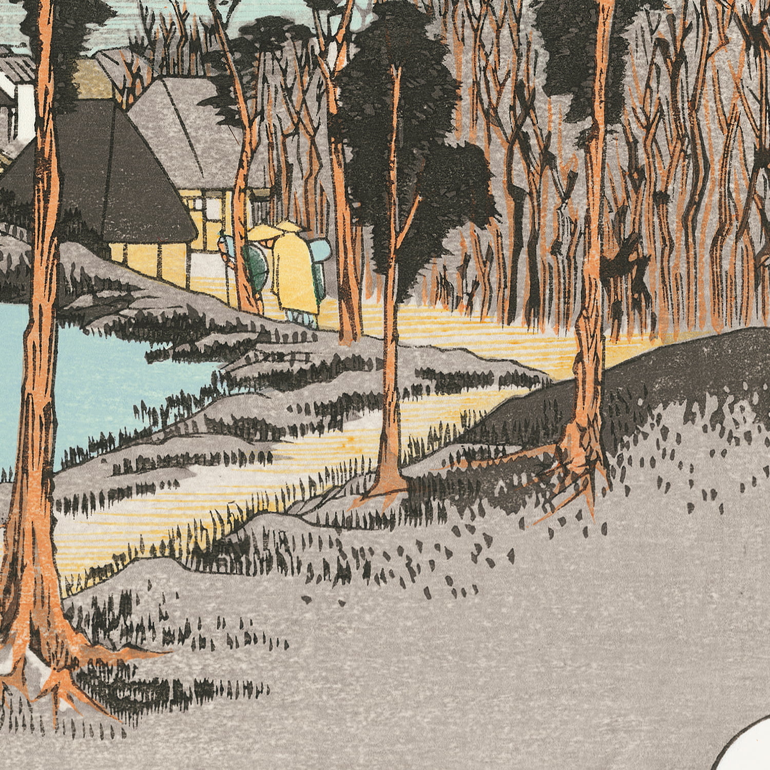 街道に沿って置かれた宿場の景観や習俗などを描き、四季を織り交ぜた風景の美しさはもちろん、ユーモアあふれる人々の描写やベロ藍を用いた鮮やかな色使いで人々を魅了したこの名所絵シリーズは、街道が整備されたことで起こった旅ブームも手伝って空前の大ヒット、広重を一躍人気浮世絵師に押し上げました。