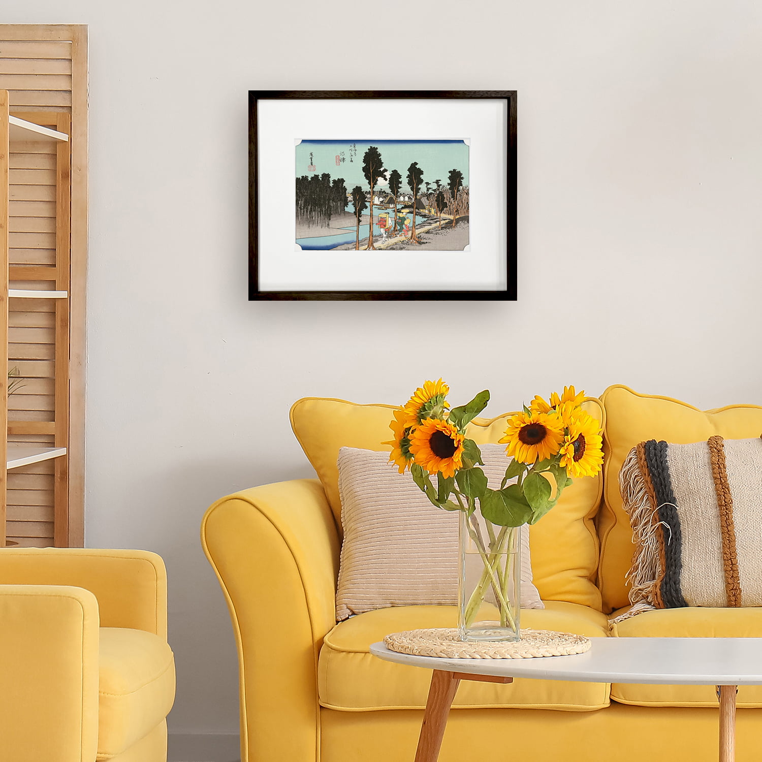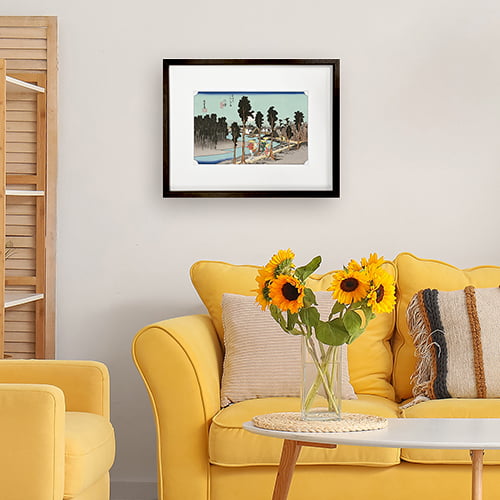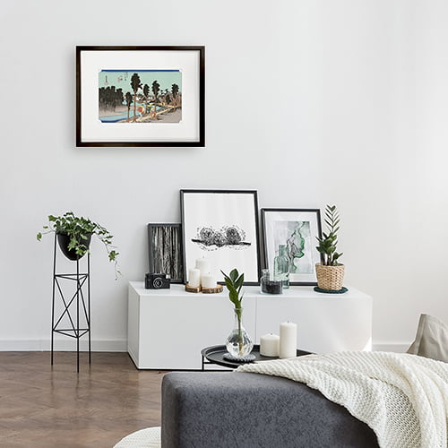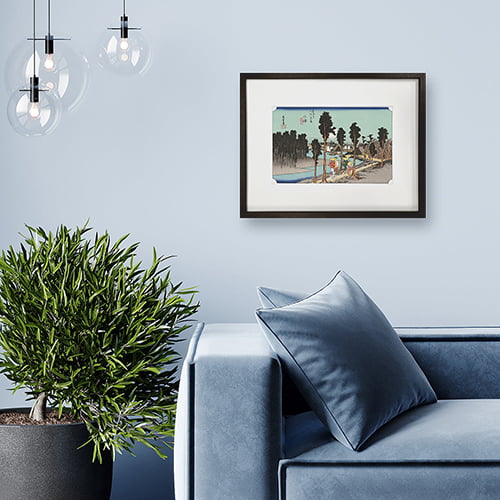 浮世絵の寸法は現代絵画と縦横比が異なるため、既成の額縁では最適なサイズを見つけるのが困難です。 より作品が美しく見えることを考慮し、版三がオーダーした高級感ある額縁に入れてお届けいたしますので、そのまま飾ってお楽しみいただけます。