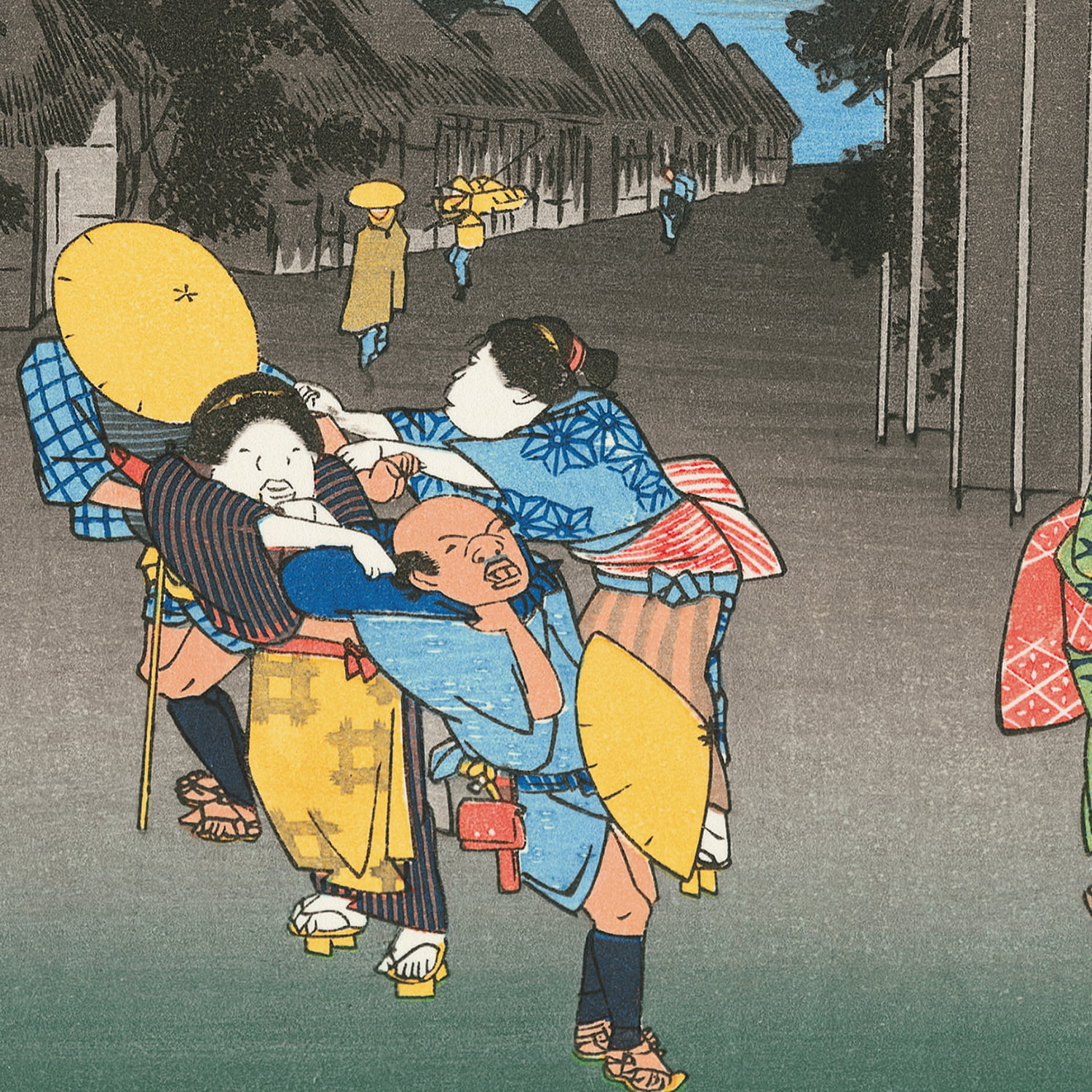歌川広重の名作版画集・東海道五十三次より、御油宿の客引きの様子を描いた「御油 旅人留女」の復刻版。
