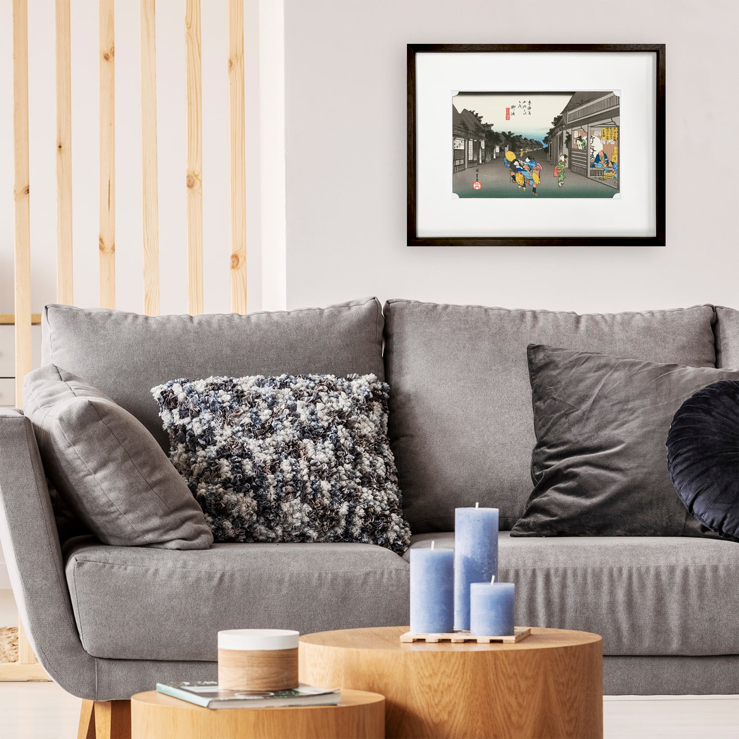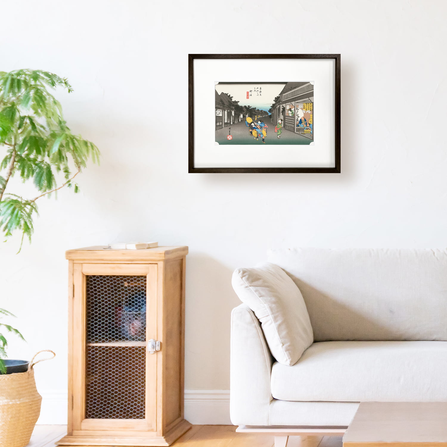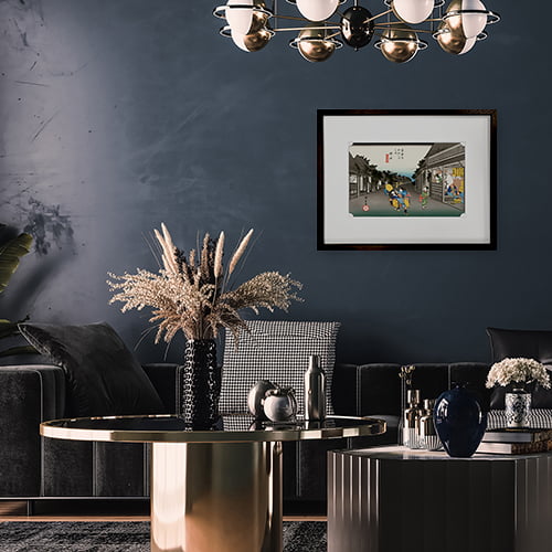 浮世絵の寸法は現代絵画と縦横比が異なるため、既成の額縁では最適なサイズを見つけるのが困難です。 より作品が美しく見えることを考慮し、版三がオーダーした高級感ある額縁に入れてお届けいたしますので、そのまま飾ってお楽しみいただけます。