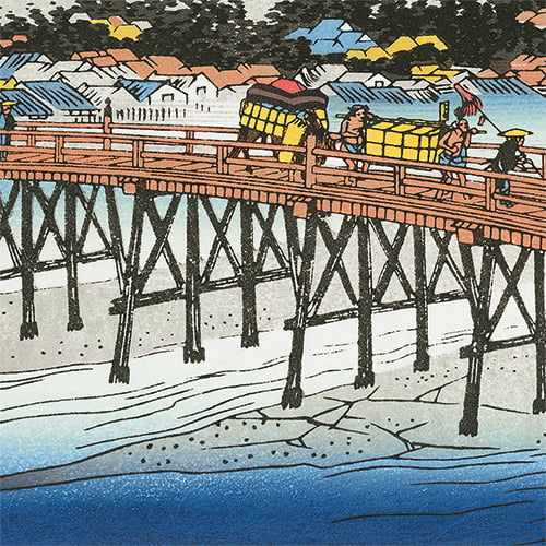 歌川広重の名作版画集・東海道五十三次より、江戸からの旅の終着地点・京の玄関口を描いた「京師 三条大橋」の復刻版。