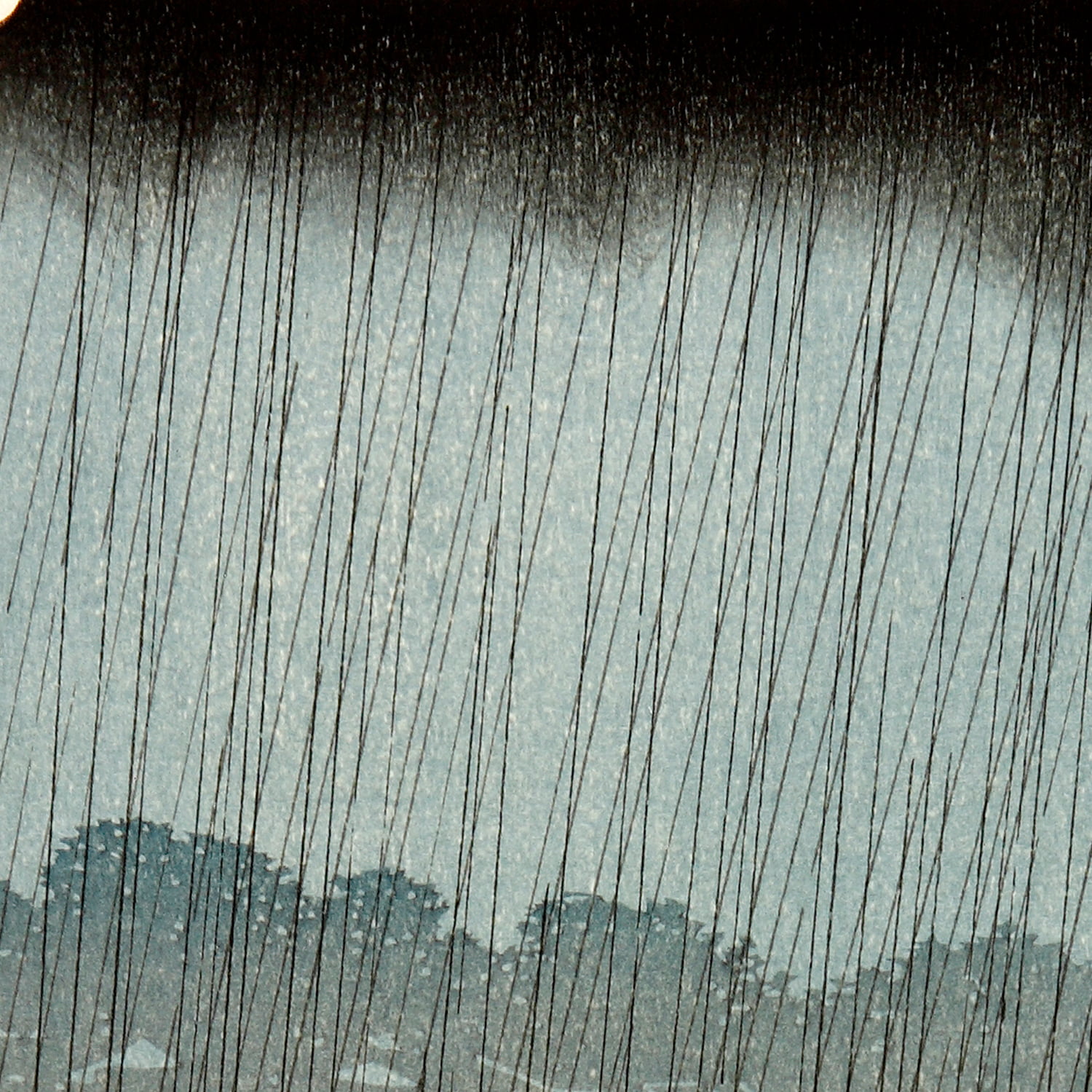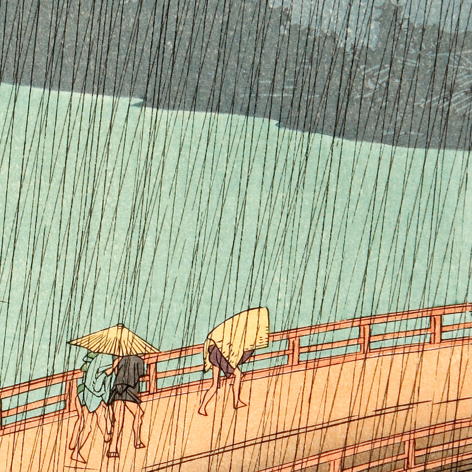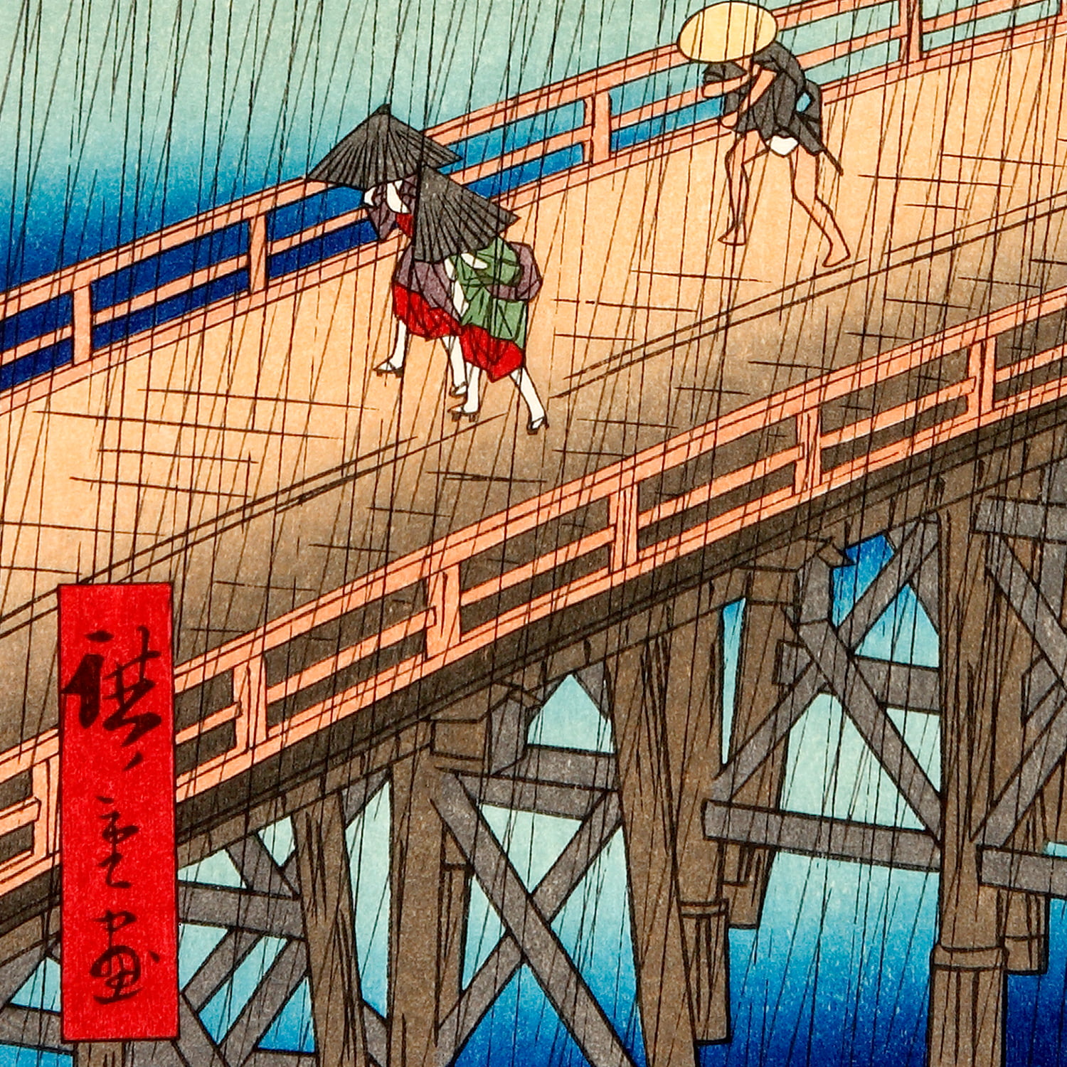 画面の大部分を橋が横切る構図にすることで遠近感を生み出し、手前には雨に濡れながら急ぎ足で渡る人々、奥には静かに浮かぶ船を描くことで、雨の激しさと江戸の風情を同時に伝えています。