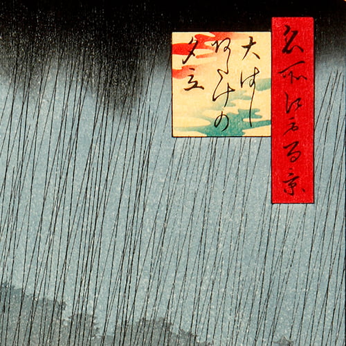 江戸の隅田川に架かる「大橋」(現在の両国橋の近く)と、「あたけ」(安宅)を舞台に、突然の夕立に見舞われた人々の姿を描いた作品です。
