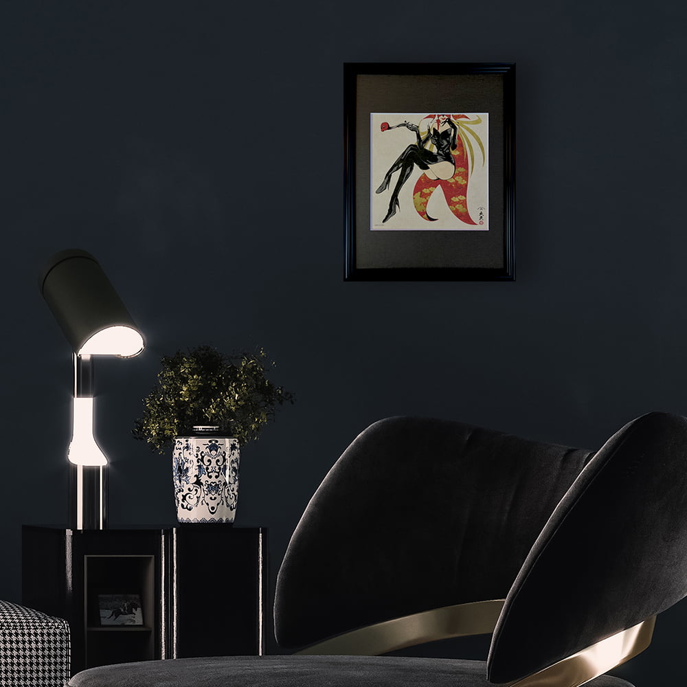 浮世絵の寸法は現代絵画と縦横比が異なるため、既成の額縁では最適なサイズを見つけるのが困難です。 より作品が美しく見えることを考慮し、版三がオーダーした高級感ある額縁に入れてお届けいたしますので、そのまま飾ってお楽しみいただけます。