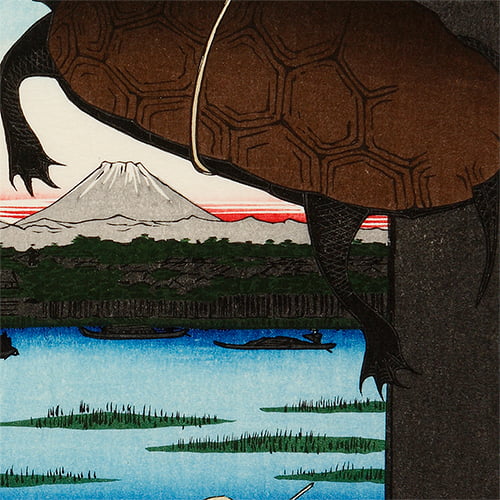 観る者がその場に立って景色を眺めているかのような構図で描かれる夏の情景と吊るされた亀。 奇抜で奥行きのある構図が目を引きます。