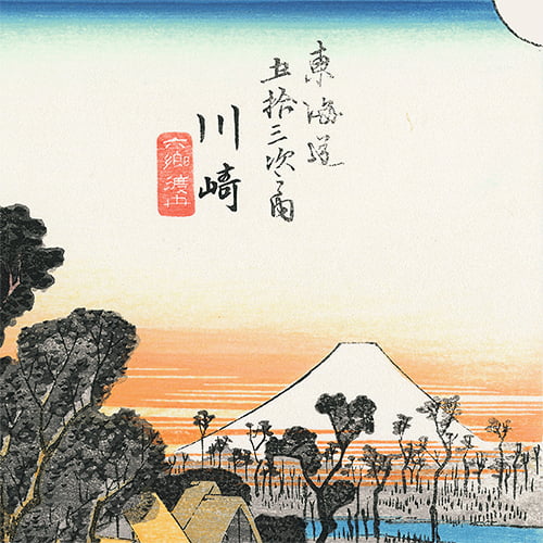街道に沿って置かれた宿場の景観や習俗などを描き、四季を織り交ぜた風景の美しさはもちろん、ユーモアあふれる人々の描写やベロ藍を用いた鮮やかな色使いで人々を魅了したこの名所絵シリーズは、街道が整備されたことで起こった旅ブームも手伝って空前の大ヒット、広重を一躍人気浮世絵師に押し上げました。