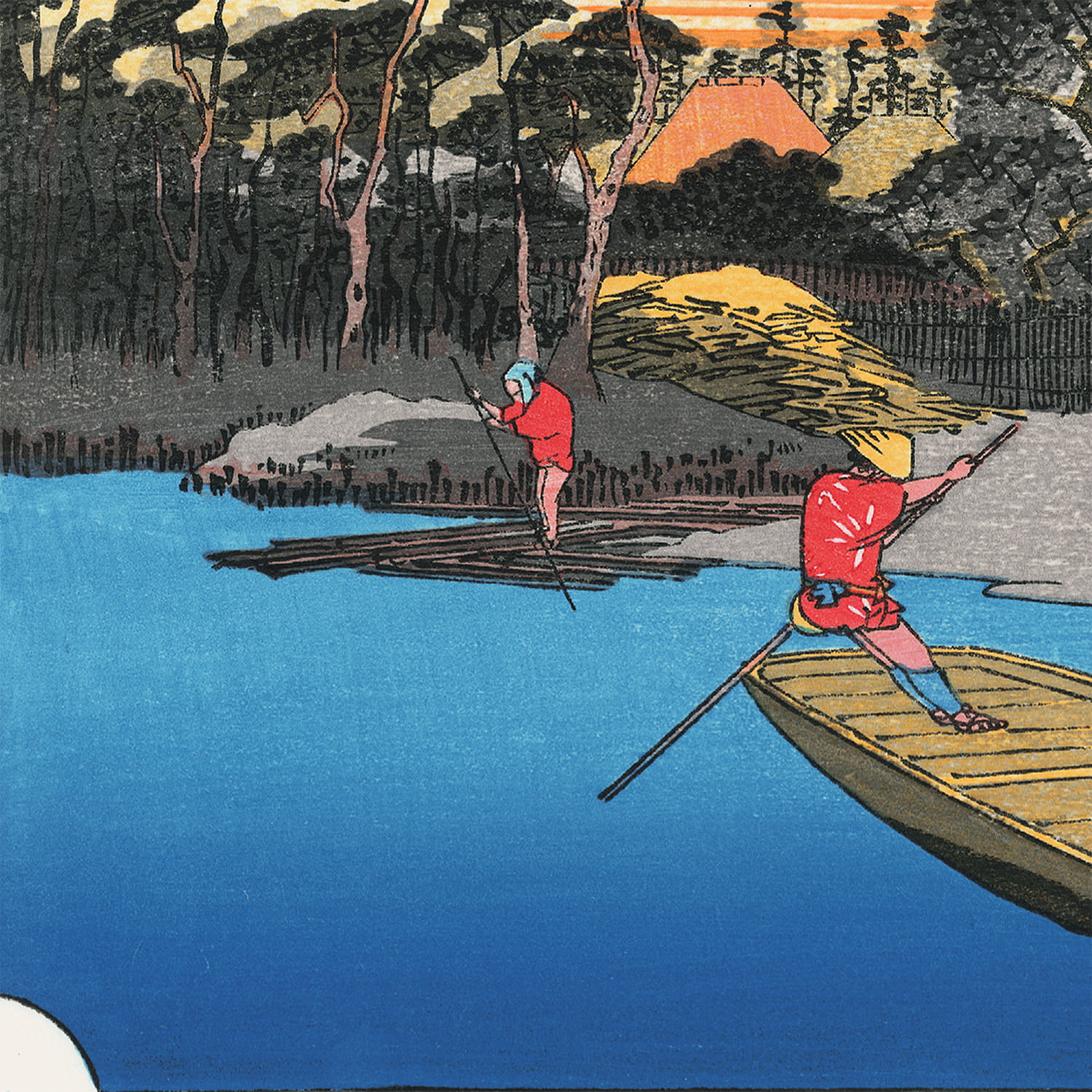 船を操る船頭の姿や岸辺で舟を見つめる裸の男など人物表現にも広重らしい温かみとユーモアが光ります。
