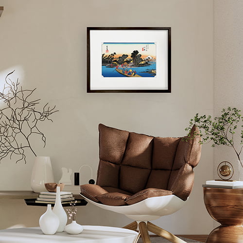 歌川広重の名作版画集・東海道五拾三次より、六郷川の渡し舟の情景を描いた「川崎 六郷渡舟」の復刻版。