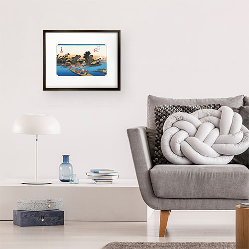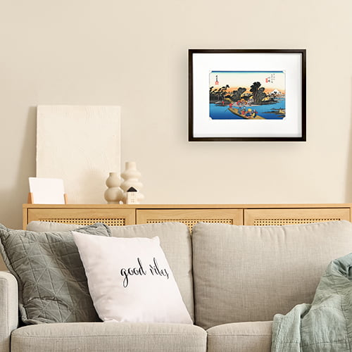 浮世絵の寸法は現代絵画と縦横比が異なるため、既成の額縁では最適なサイズを見つけるのが困難です。 より作品が美しく見えることを考慮し、版三がオーダーした高級感ある額縁に入れてお届けいたしますので、そのまま飾ってお楽しみいただけます。