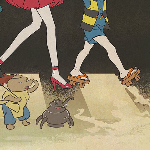 人間の世界と異界が交わるような瞬間に、妖怪たちが歩いている様子を描きました。