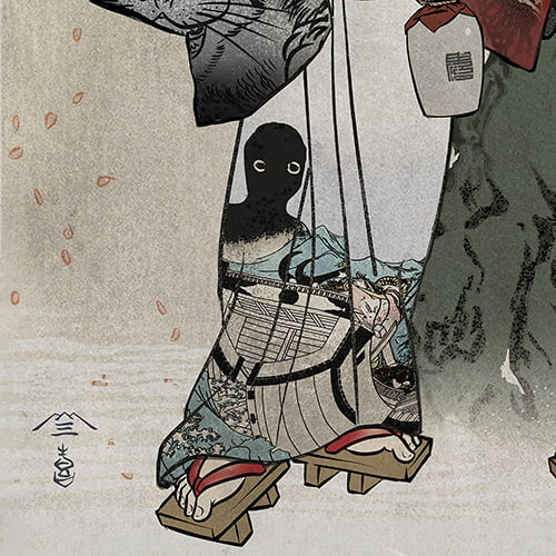 モチーフには、歌川国芳「雷正九郎(庄九郎)」や歌川芳春「青砥稿花紅彩画 白浪五人男」、歌川国貞(三代目歌川豊国)「花誘吉原の夜雨 東八景ノ内・中村歌右衛門」などを採用しています。