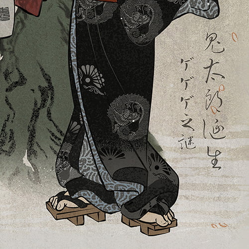 この作品では、江戸浮世絵の役者絵の名作「花誘吉原の夜雨」をベースに、現代の妖怪世界と重ね合わせることを試みました。 鬼太郎の父たちの粋で歌舞いた姿に、儚くも美しい桜と、季節外れの雪を加えることで、幻想的かつ不穏な空気感を演出しました。