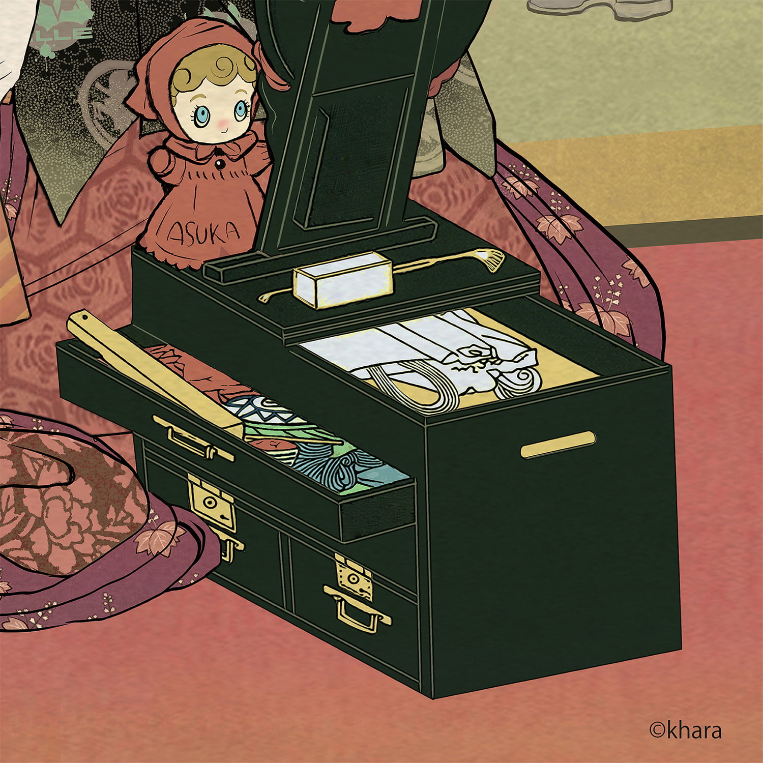 小物の配置にも意味を込め、アスカの思春期らしい一面を表現しました。手にする扇子も、洒落をきかせつつ、彼女の性格を象徴しています。