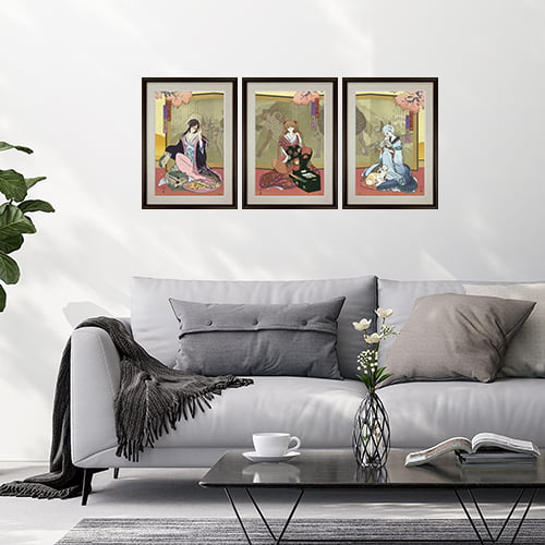 美人画の名手・喜多川歌麿の連作「鳳凰三美人図」をモチーフに、3人のヒロインを姫君に見立てて描いた「箱根八里美人三画揃」のうちの一枚です。