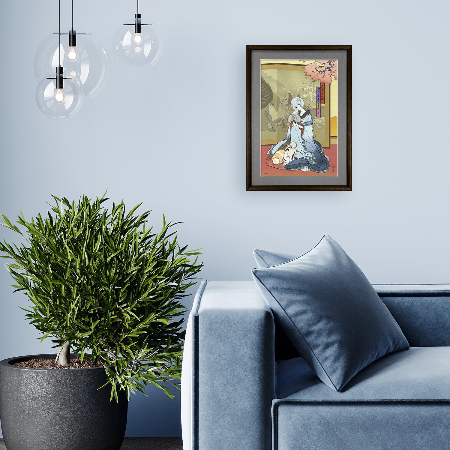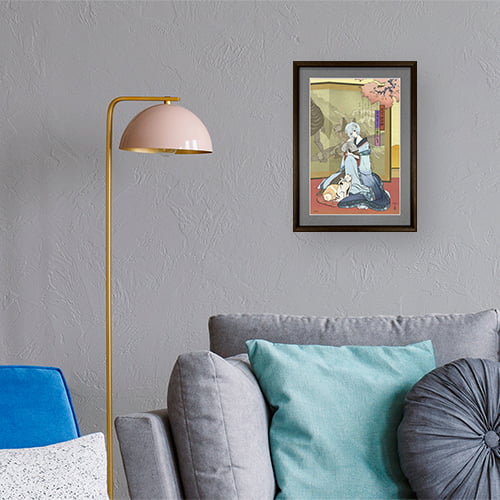 浮世絵の寸法は現代絵画と縦横比が異なるため、既成の額縁では最適なサイズを見つけるのが困難です。 より作品が美しく見えることを考慮し、版三がオーダーした高級感ある額縁に入れてお届けいたしますので、そのまま飾ってお楽しみいただけます。