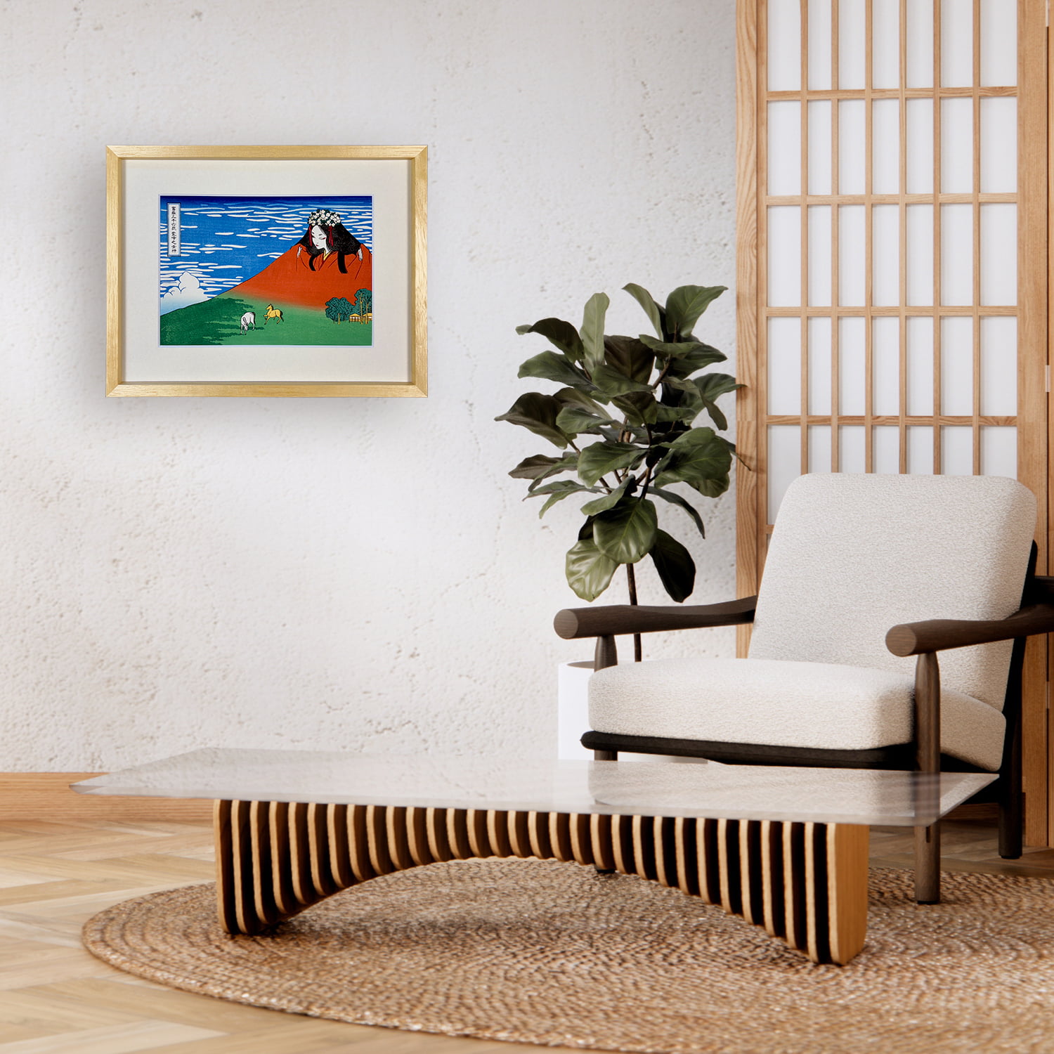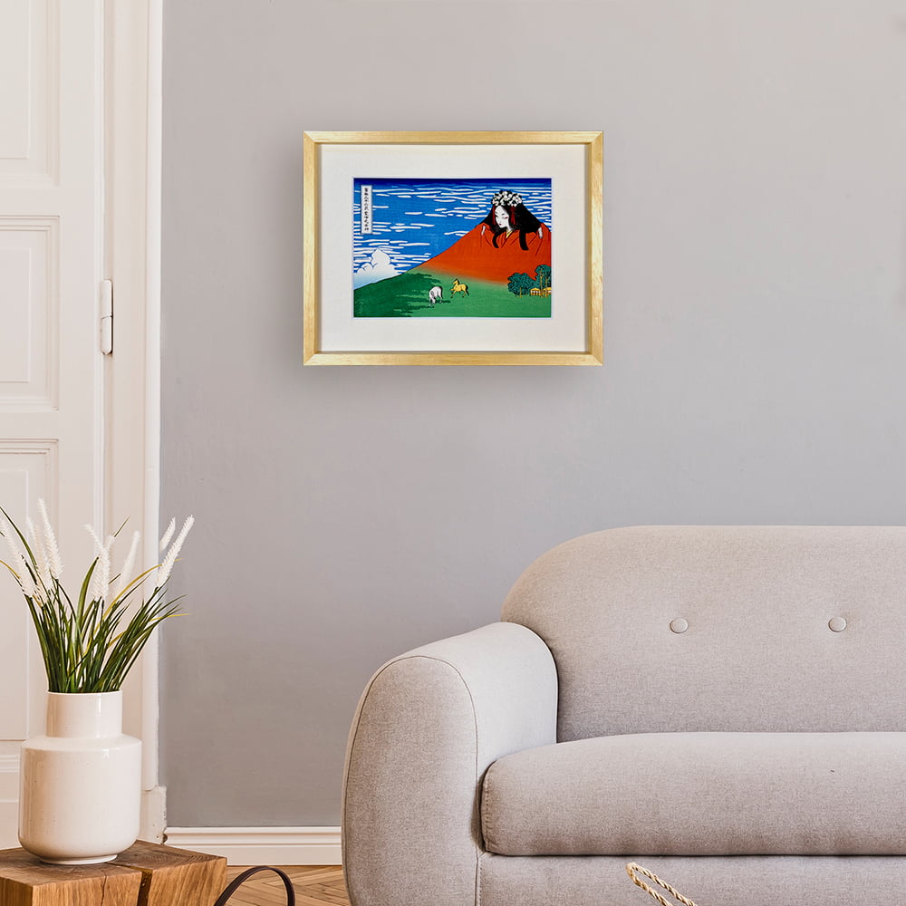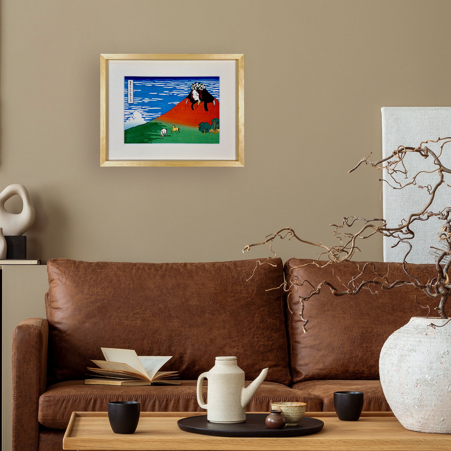 葛飾北斎の名作「冨嶽三十六景 凱風快晴(赤富士)」をモチーフに、富士山を背景とした民話の情景を描いた作品です。