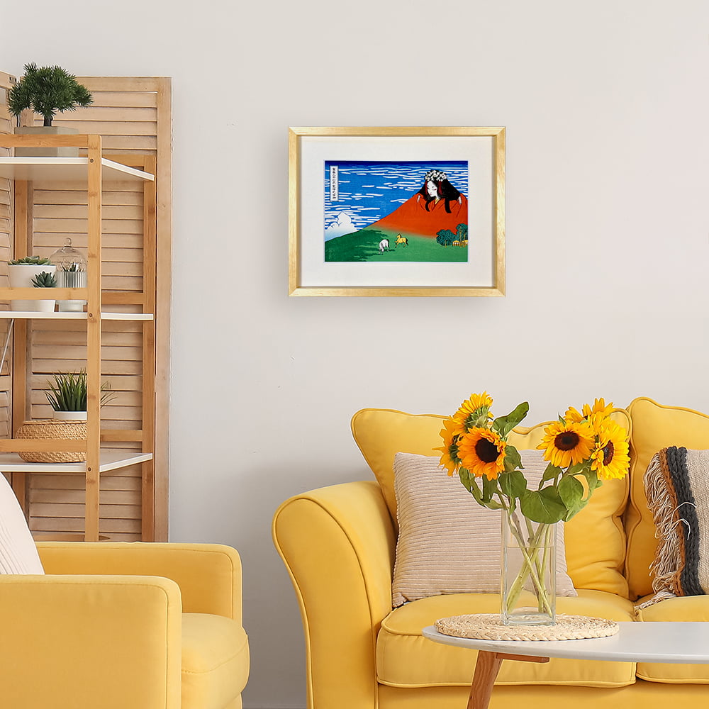 葛飾北斎の名作「富嶽三十六景 凱風快晴」をモチーフに、富士山の麓で暮らす馬や里の人々を優しく包む女神の姿を神話調に描いた作品です。