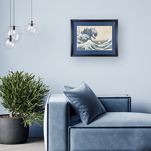 北斎が生み出した黄金比の構図を活かしながら再構築された本作は、ゴジラの恐怖と浮世絵の美を同時に味わえる一枚です。