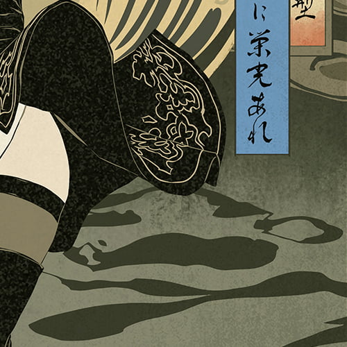 絵師を務めるのは、『NieR』シリーズの始まりとなった「NieR Replicant/Gestalt」のキャラクターデザインを手掛け、その独特な世界観でファンを魅了し続けるD.K氏。 月夜を背に黒衣を翻す「2B」の凛とした立ち姿が、江戸時代から続く伝統技術によって描き出されます。
