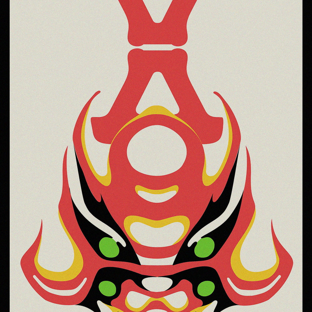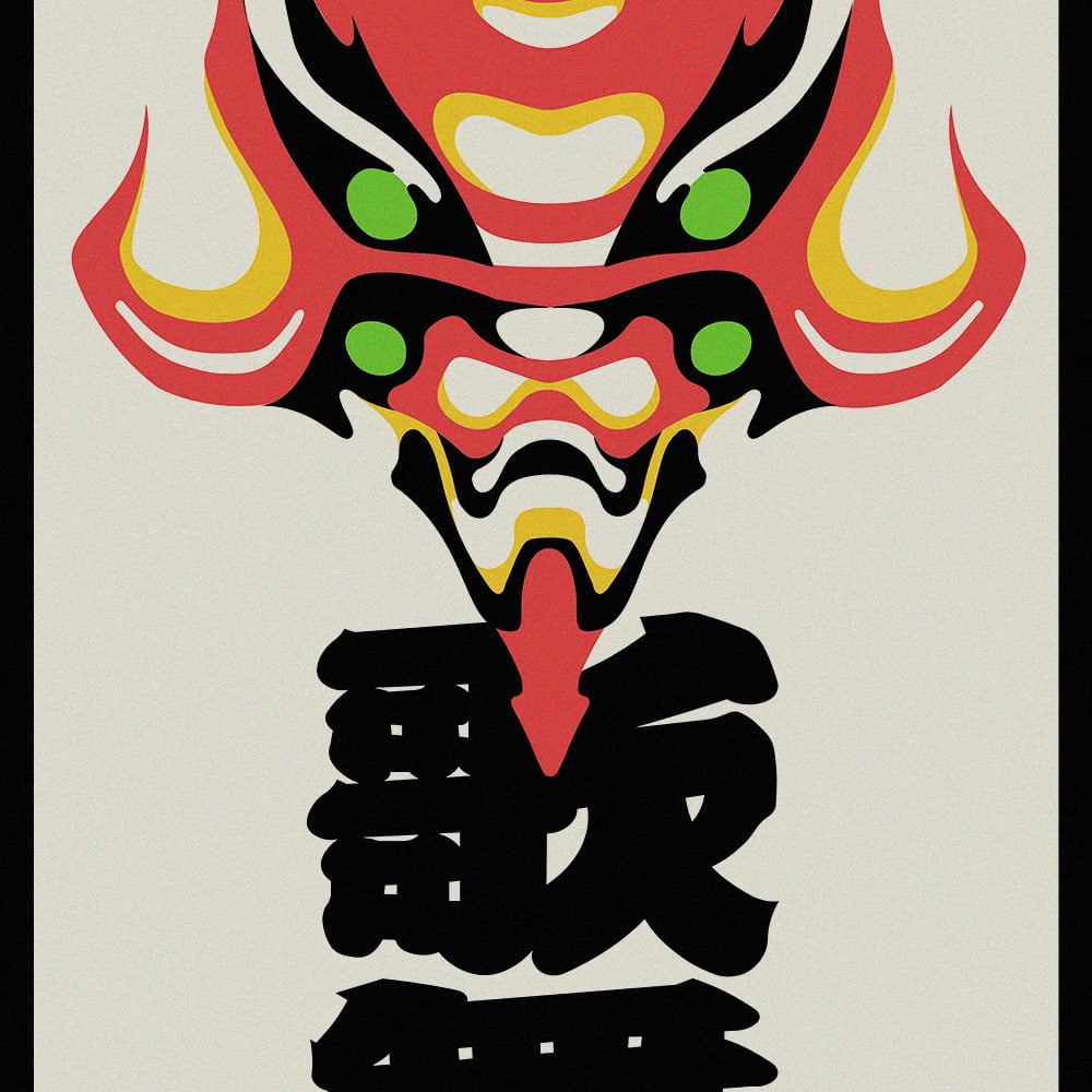 縦長の画面構成の中で、力強い題字と仮面性を帯びた造形が呼応し、新世紀と伝統が鮮やかに交差します。