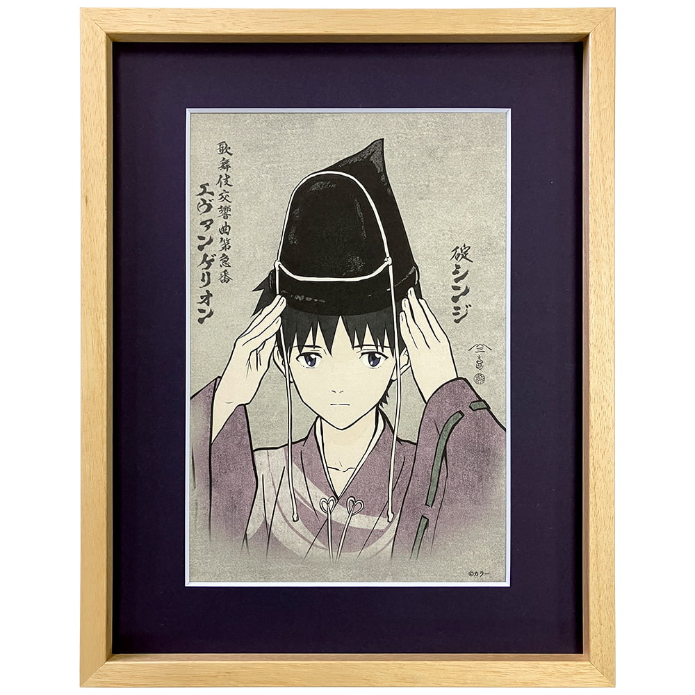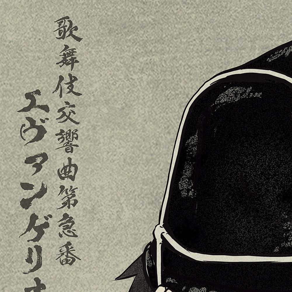「歌舞伎交響曲第急番 エヴァンゲリオン」実施記念として描いた大首絵。 本番前、烏帽子を整えながら静かに集中を高めていく支度の瞬間を切り取っています。